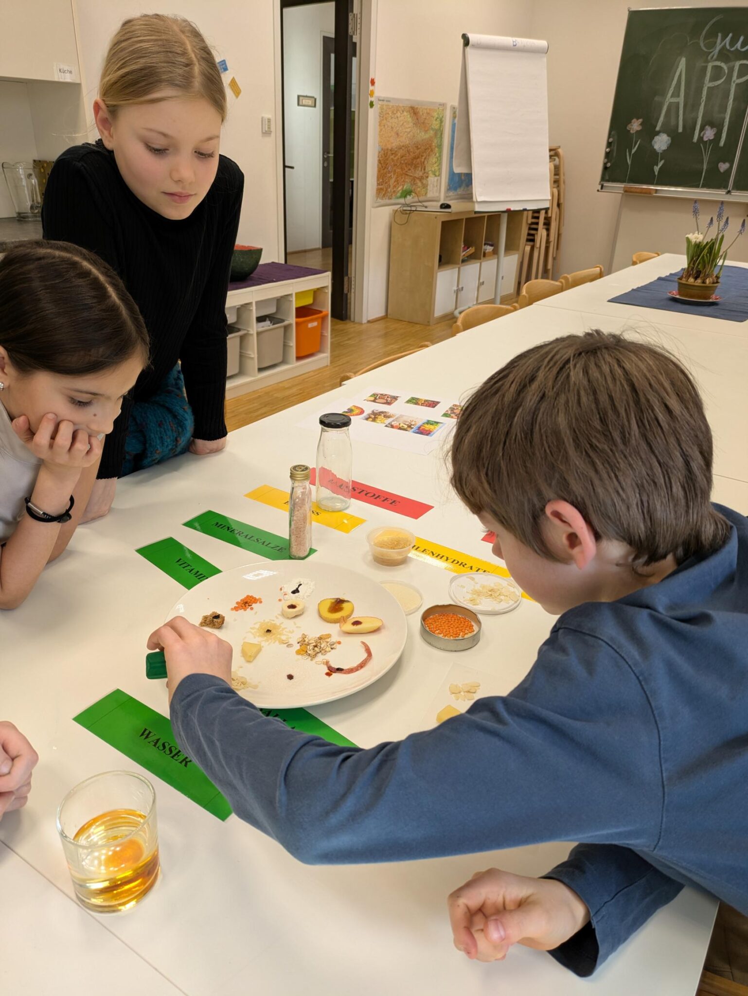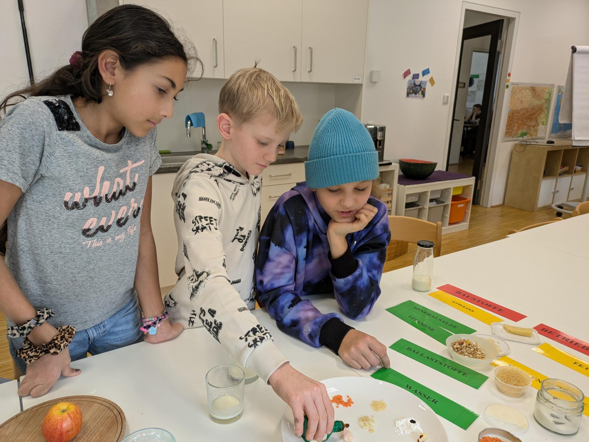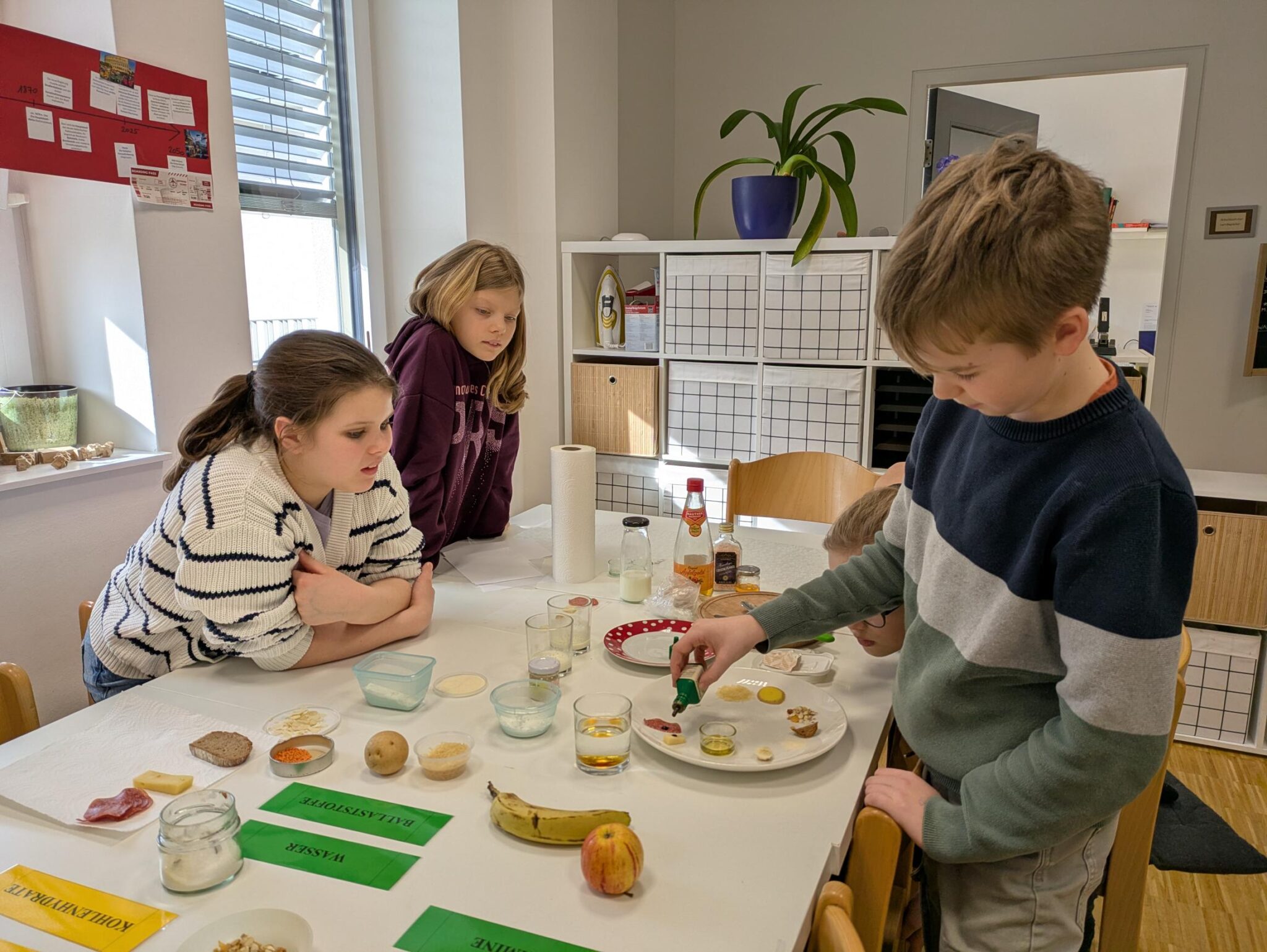 Um den Bausteinen unserer Nahrung auf die Spur zu kommen, testeten wir einige unserer Lebensmittel auf ihre Zusammensetzung. Dafür stellten wir vorher unsere Hypothesen auf. Wir versuchten Eiweiß mit Säuren zum Gerinnen zu bringen und wiesen Fett mithilfe von saugendem Papier nach. Für den Nachweis von Kohlehydraten verwendeten wir Jod. Interessiert beforschten die Kids ihre Nahrungsmittel.